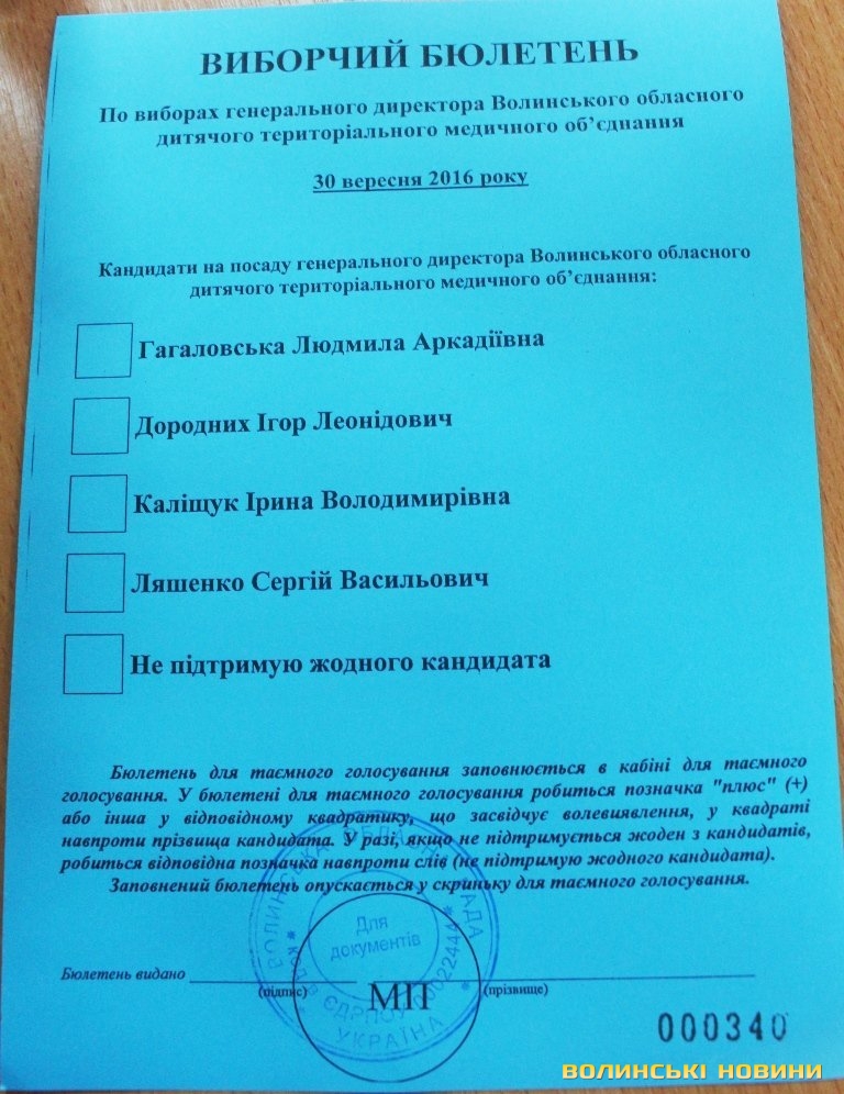 «Жодної політики в призначенні керівника не буде. Кандидатура на посаду генерального директора буде спочатку розглядатися на «медичній» комісії облради. Після її висновків розглянемо можливість призначення керівника обласного дитячого територіального об’єднання на сесії 6 жовтня. Ви повинні обрати людину, яка переживатиме за вас і за лікарню, яка буде «вибивати» кожну копійку в бізнесменів, у фондів, робити все для того, аби лікарня процвітала, аби тут запроваджувалися сучасні технології, покращувалися умови праці, аби персонал отримав можливість підвищувати свій рівень знань закордоном. Це залежить від однієї людини – від того керівника, якого ви оберете», – наголосив свого часу Ігор Палиця.Тож сьогодні, 30 вересня, в актовому залі закладу стартувало таємне голосування. У виборчому бюлетені працівники можуть поставити свою позначку в кабінці для таємного голосування за одного з кандидатів. Їх четверо: Людмила Гагаловська, Ігор Дородних, Ірина Каліщук та Сергій Ляшенко. Є, звичайно, в бюлетені й графа «Не підтримую жодного».Ігор Хом’як з травня працює на посаді старшої медичної сестри, до того працював анестезіологом. Він розповідає: колектив лікарні дуже великий - майже тисяча працівників, близько 450 з них медичні сестри. Попередньо, багато працівників обіцяли прийти на вибори, сподіваючись на хороші зміни в закладі.«Це дуже демократично, бо всі працівники можуть висловити свою думку, проголосувати за гідного кандидата і обрати для лікарні гідну людину. Люди приїжджають з дому, з відпусток, з декрету, бо хочуть висловити свою думку», - зауважив він.