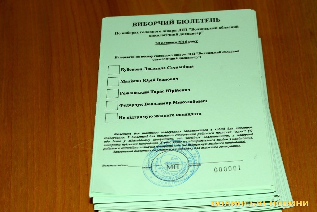 Вибори головного лікаря шляхом таємного голосування стартували у Волинському обласному онкологічному диспансері. На посаду претендують четверо кандидатів.