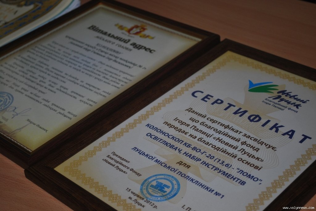 Сертифікати про передачу колоноскопів від Благодійного Фонду «Новий Луцьк» – цього разу для Луцьких поліклінік №1,2 – вручив батько народного депутата і засновника фонду Петро Палиця. Він привітав колективи закладів з прийдешнім професійним святом і зауважив, що Ігор Палиця прагнув особисто вручити обладнання поліклініці, однак з поважних причин не встигає прибути з Києва на урочистості.