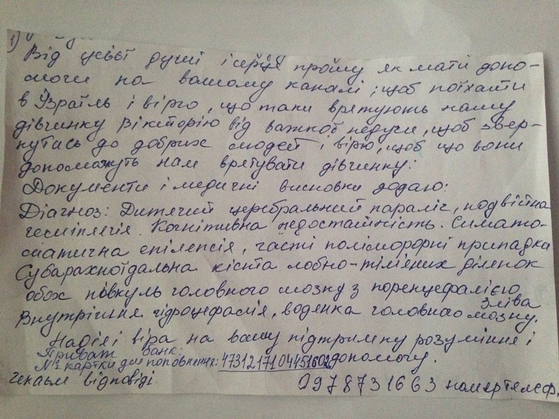 Лікувати дитину погодилися у ізраїльській лікарні Хаддаса. Лише на обстеження у медзакладі, яке триватиме 5-7 днів, та проживання неохідно $7 000 доларів. Вже за результатами обстеження, дитині призначать операцію, яка обійдеться у 100 тисяч доларів.