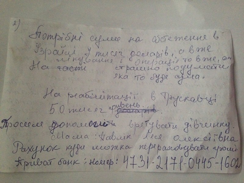 Усі, кому небайдужа доля 6-річної дічинки, можуть переказати кошти за такими реквізитами: рахунок ПриватБанку 4731 2171 0445 1602 мама Павлік Леся Олексіївна (097 873 16 63).