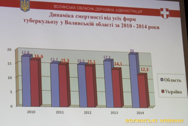 З його слів, торік захворюваність всіма формами активного туберкульозу в абсолютних цифрах становила 713 осіб (68,65 на 100 тисяч населення). У 2013 році було 700 хворих (67,49 чоловік на 100 тисяч населення).