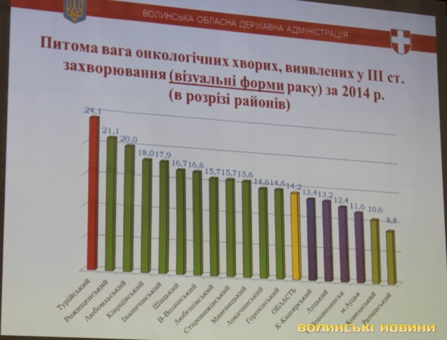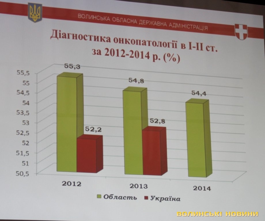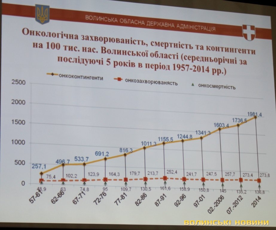 Аналізуючи ситуацію із онкозахворюваністю на Волині починаючи з 1957 року, начальник управління охорони здоров’я облдержадміністрації Ігор Ващенюк зазначив, що контингент хворих збільшується, але й більше хворих виліковують. Показники смертності стабільні та мають тенденцію до зниження. Рівень онкозахворюваності на Волині нижчий від загальноукраїнського, профілактичне виявлення захворювань 1-2 стадії на рівні минулого року (56,4%), 3-ї стадії – 14,2%.