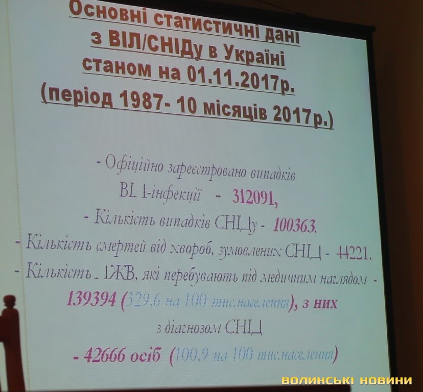 Зі слів головного лікаря комунального закладу «Волинський обласний центр з профілактики та боротьби зі СНІДом» Олени Макаренко, в Україні епідемія СНІДу розпочалася у 1995 році. Тоді ВІЛ-інфекцію почали фіксувати серед ін’єкційних наркоманів. На Волині вперше її зафіксували у березні 1996 року. Нині Волинь лишається лідером серед вісьмох західноукраїнських областей за кількістю ВІЛ-позитивних осіб на 100 тисяч населення.В Україні високим лишається рівень захворюваності на ВІЛ – за станом на початок року в державі проживали 238 тисяч ВІЛ-інфікованих. За увесь період епідемії в країні померли 44 тисячі осіб.