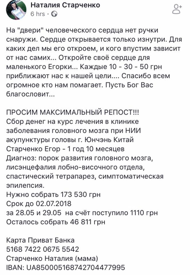 «Наталія Старченко, дівоче прізвище Гусар, жителька с.Старовойтове, учениця Рівненської ЗОШ, наша землячка, вкотре просить про допомогу. Бог послав їм випробування - хворобу синочка. У них зараз є унікальна можливість поїхати на лікування за кордон. Проте, як завжди, все впирається в гроші. Давайте кожен, хто скільки зможе, перерахує по 10,20,50 грн. Цим ми дамо малечі шанс на одужання», - пише у соцмережі Оксана Крижук.
