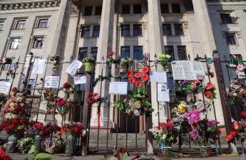 В Одесі на честь п'ятої річниці трагедії на Куликовому полі, коли у 2014 році в Будинку профспілок згоріли люди, проходять акції пам'яті. Люди несуть до будівлі квіти і свічки