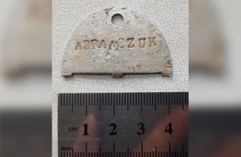 Жетон має вигляд металевої пластини напівкруглої форми. У верхній частині є наскрізний отвір, ймовірно, для шнура чи кріплення. На поверхні викарбуване великими літерами прізвище військового польською мовою ABRAMCZUK (Абрамчук).