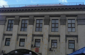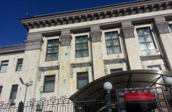 Більше двохсот активістів пікетують посольство Російської Федерації у Києві в зв'язку з проникненням російських танків на територію України та збитим літаком ІЛ-76