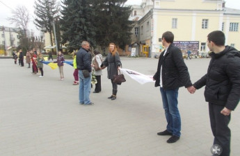Кілька десятків людей сьогодні зібралися в центрі міста для того, аби долучитися до Всеукраїнської акції «Ланцюг єднання»