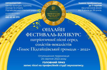 Аби збадьорити дух мешканців громади та захисників, які мужньо боронять рідну землю, КЗ «Центр культури, туризму, молоді та спорту» Підгайцівської сільської ради започаткував онлайн-фестиваль патріотичної пісні. Головний приз – запис пісні у професійній студії. Переможця обіцяють оголосити у День Незалежності України, повідомляють у Підгайцівській сільраді.