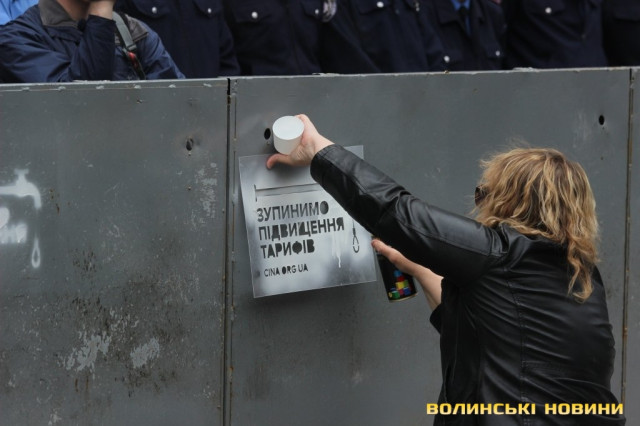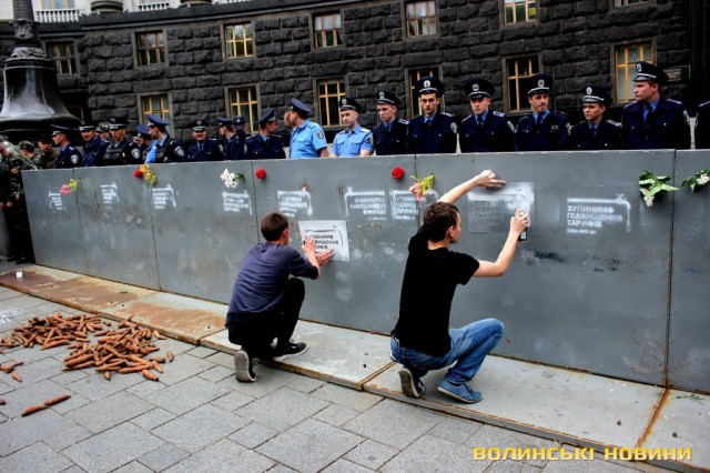 Перед будинком Кабміну учасники акції нанесли написи «зупинимо підвищення тарифів» на металевий паркан, за яким вишикувалися правоохоронці. Згодом запропонували долучитися до акції «раз в хвилину кинь морквину» - моркву у напрямку будівлі кидали активістки та активісти, висловлюючи несхвалення політики прем’єр-міністра.
