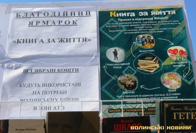 Волинські волонтери вирішили допомогти тим, хто на передовій, за допомогою книги: усі хто може приносять свої книги, аби їх продавати, а за виручені кошти планують придбати необхідні речі для волинських воїнів.