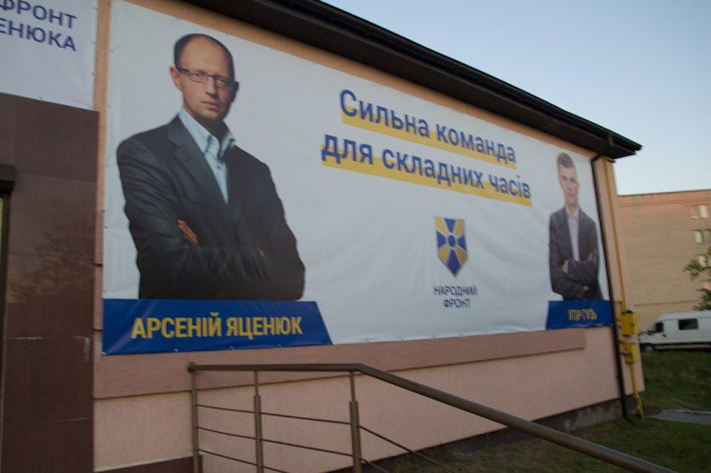 Представник штабу кандидата Кандидати в депутати від партії «Народний фронт», які балотуються по 19 та 22 виборчих округах, розпочали агітацію із порушенням законуповідомив, що ці білборди були розміщені до реєстрації кандидатом, але не як агітація, а просто як реклама, бо там немає закликів голосувати за кандидата. За його словами, після отримання усіх документів від ЦВК вони відкриють виборчий фонд з якого і будуть надалі виготовляти агітаційні матеріали.
