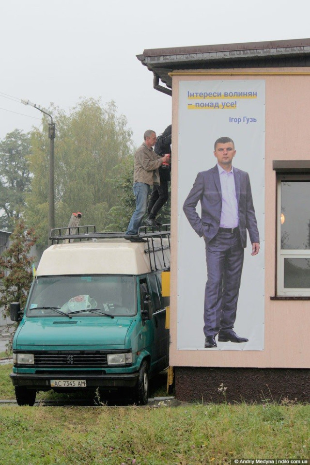 Так, висуванець партії «Народний фронт» у ВО №19, заступник голови облради Ігор Гузь розмістив на приміщенні свого штабу в місті Нововолинськ зовнішню рекламу у вигляді великих плакатів із своїм зображенням та фотографією лідера виборчого списку Арсенія Яценюка. Це було зроблено 22 вересня, коли політик ще не був зареєстрвоаний як кандидат, тож з юридичної точки зору ці дії не могли трактуватись як порушення закону.