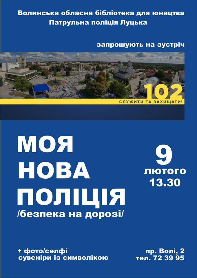 Зустріч з патрульними поліцейськими організують у Волинській обласній бібліотеці для юнацтва, що по проспекту Волі, 2. Про це написала організатор заходу Юлія Сідімянцева.