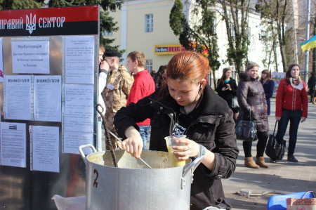 Стравою пригощали просто на Майдані. Активістки запрошували охочих скуштувати традиційну українську страву з пшона і м’яса.