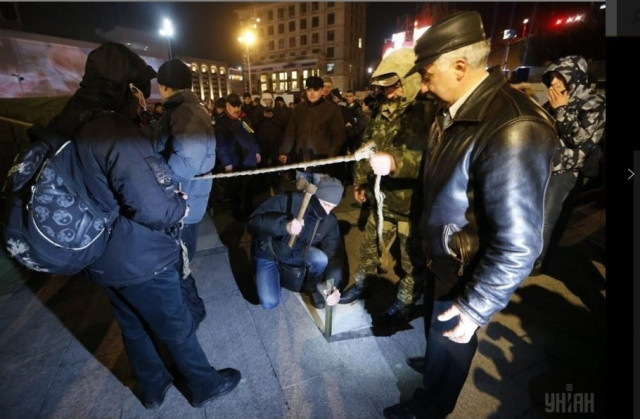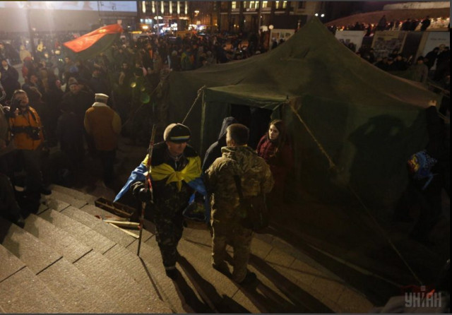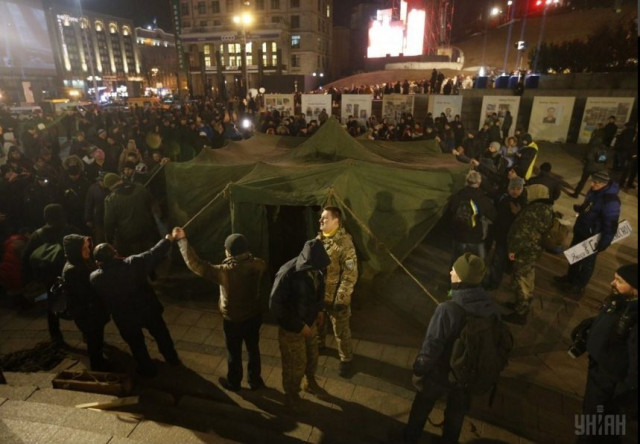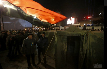 "Революційні праві сили" (РПС), які раніше зайняли приміщення актової зали у готелі "Козацький" та встановили декілька наметів біля стели Незалежності, вимагають звільнення політичних в'язнів, визнання недійсними Мінських угод та відставки уряду.