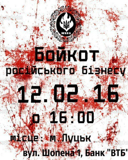 Акція «Бойкот російського бізнесу» організують у Луцьку завтра, 12 лютого, о 16:00 біля банку «ВТБ» (вулиця Шопена,1).Збор ид.. тов обязательно!
