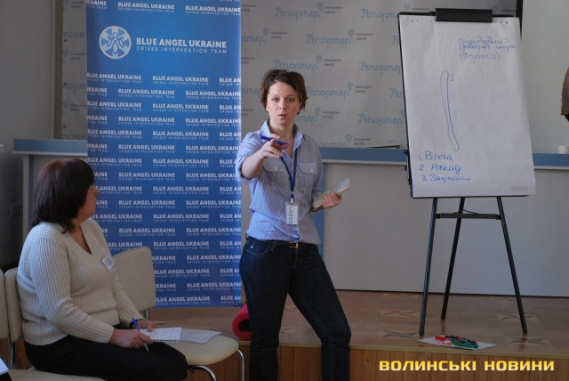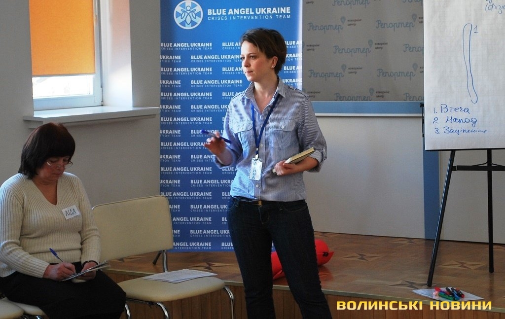 Практикуючий психолог, учасниця об’єднання психологів «BlueAngelUkraine», тренер Ганна Зінчук навчала присутніх розуміти процеси, які відбуваються в людській свідомості та організмі в цілому. Також допомогла отримати навички та вміння взаємодіяти з людьми, які знаходяться в посттравматичному стані. Завдяки практичним вправам, учасники тренінгу отримали навички надання першої психологічної допомоги.