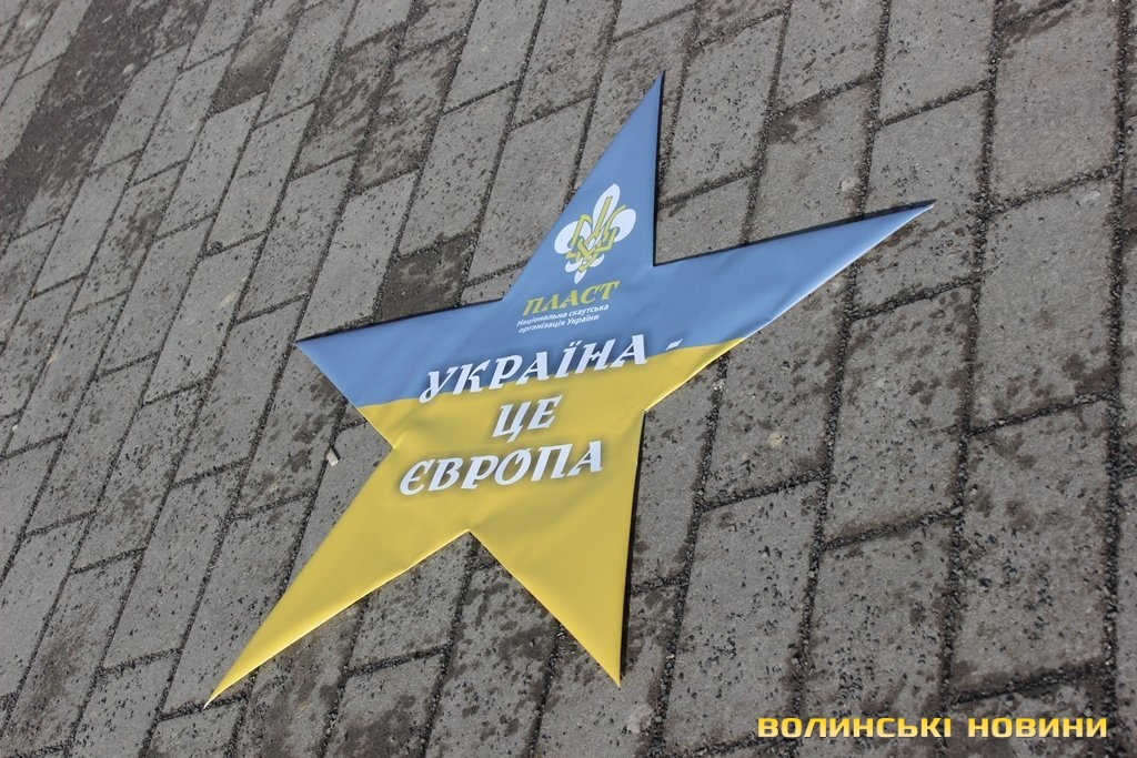 Волинські пластуни у центрі Луцька утворили зірку Європи. Символічну фігуру виклали з портретів відомих людей, долі яких пов’язані як з Україною, так і Європою.