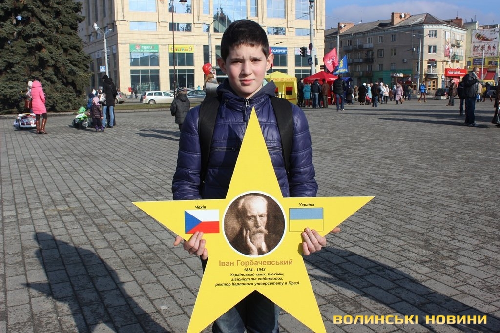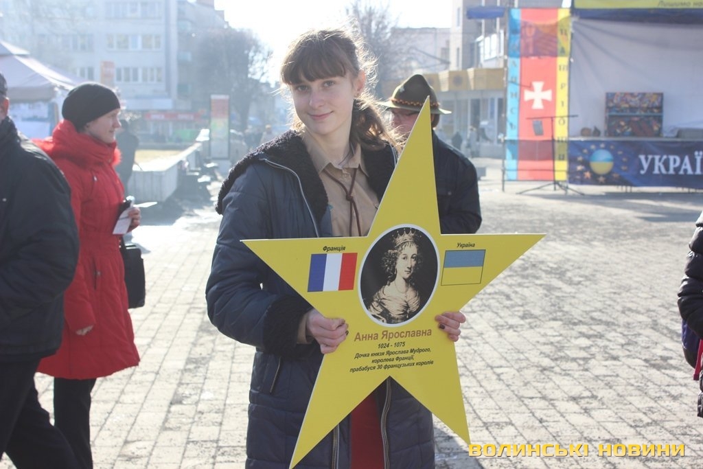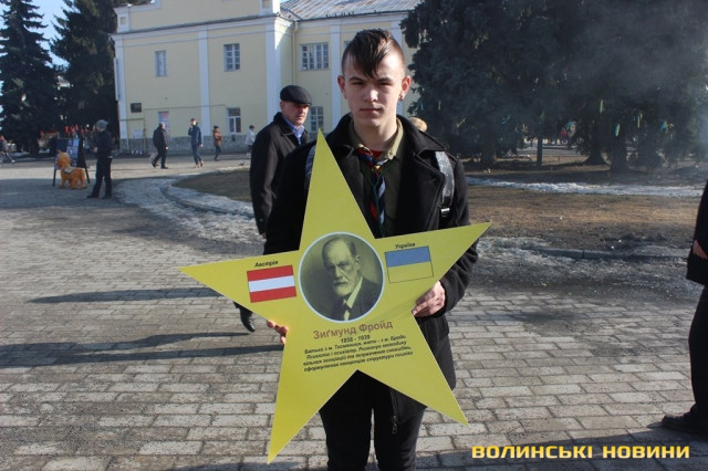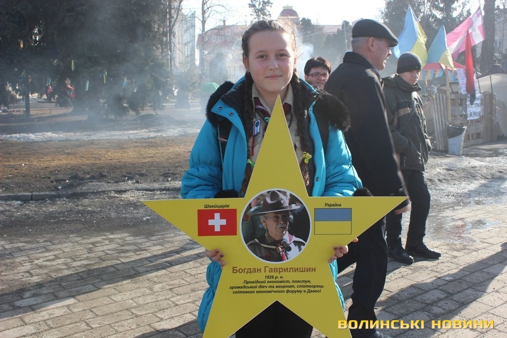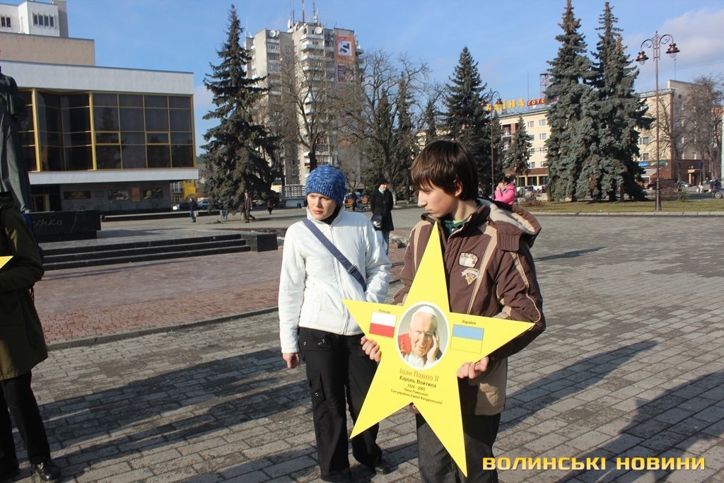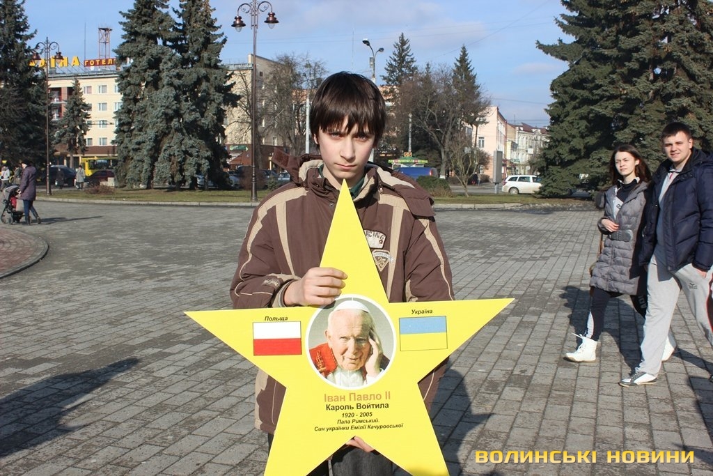 Пластуни віком від 14 до 20 років утворили коло. В руках тримали 12 зірок з портретами відомих усьому світу людей. Центральною була українська зірка.«Україна здавна була європейською країною й відігравала важливу культурно-економічну роль у її розвитку. Ми хочемо звернути увагу громадськості на те, що Україна – це Європа. Для прикладу, батьки психолога Зигмунда Фрейд родом з України (мати з міста Броди, батько з міста Тисмениця), а мати Папи Римського Івана Павла II також українка – Емілія Качуровська», - розповіла прес-секретар волинського осередку української скаутської організації «Пласт» Надія Михайлова.Як тільки пластуни вишикувалися в коло – одразу почали підходити перехожі, як дорослі, так і малі.