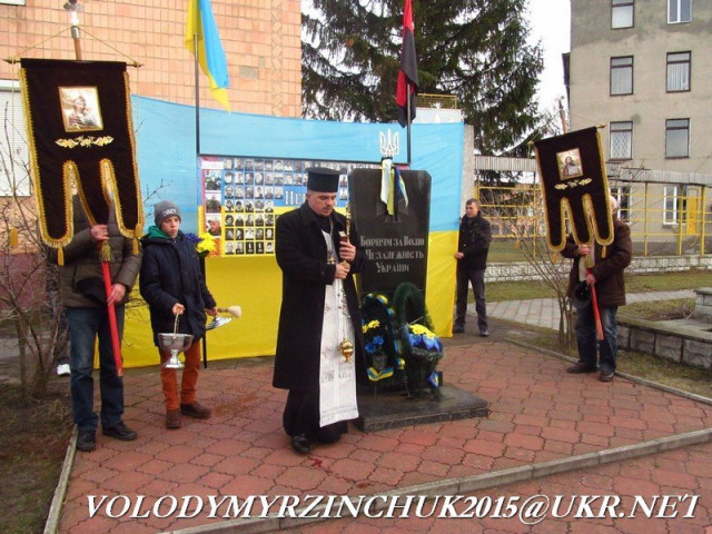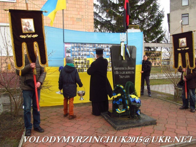 Біля храму святого Василія Великого УПЦ КП , де становлений банер, настоятель отець Іван Зеленко відслужив панахиду за загиблими героями, - повідомили представники місцевої громади.