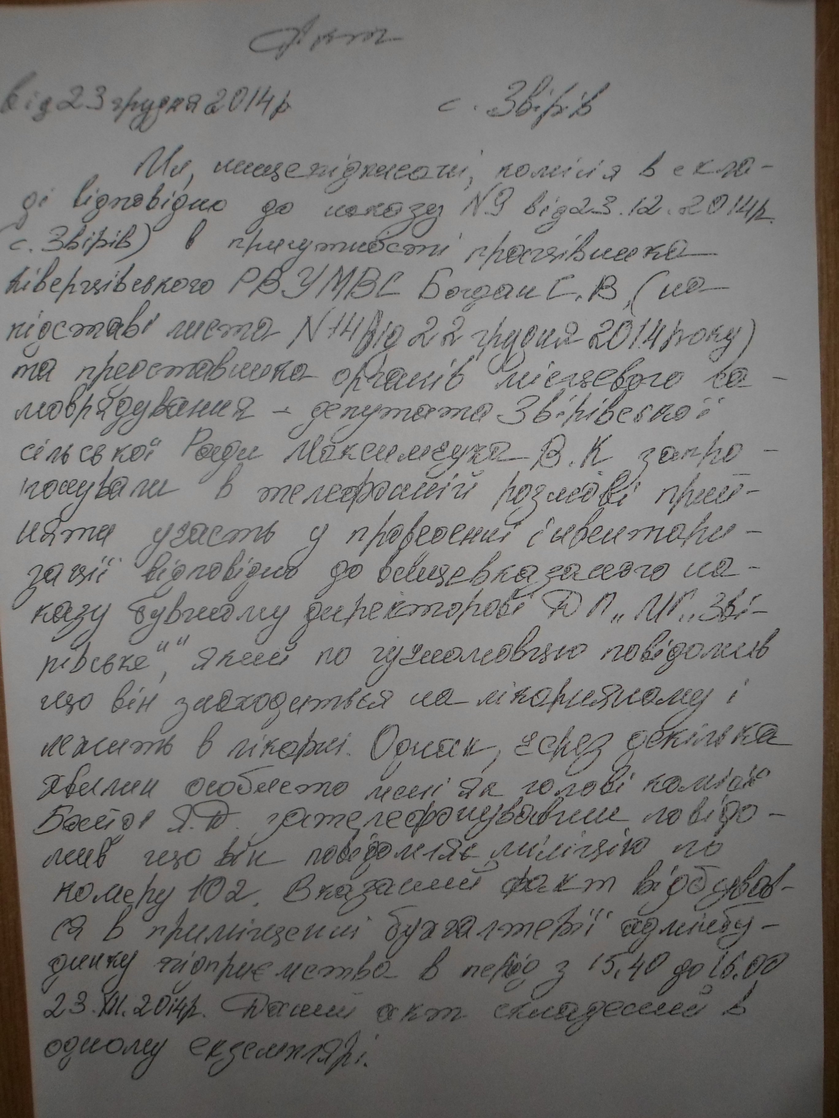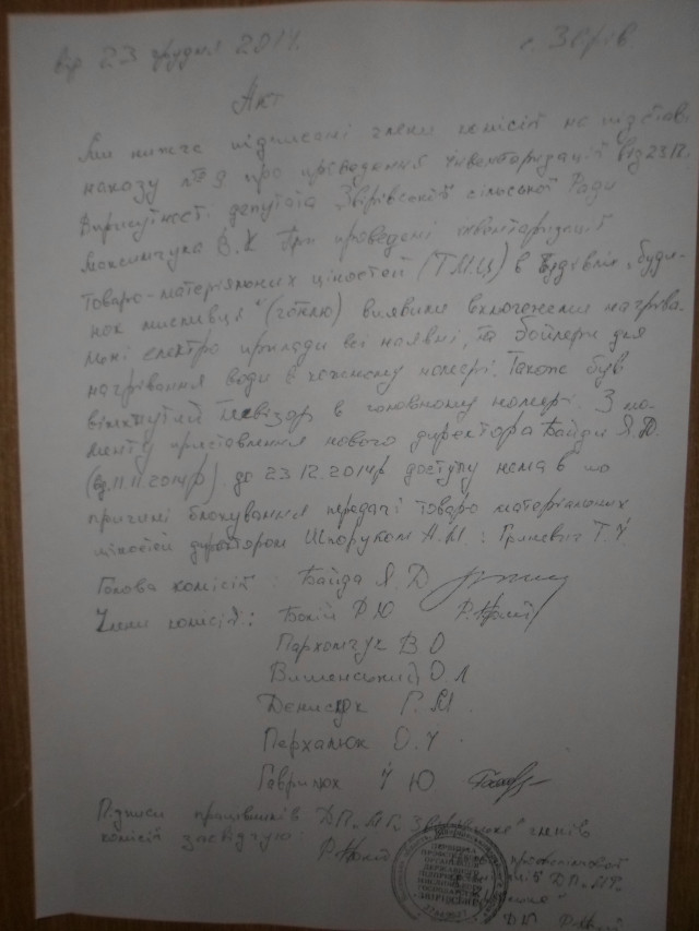 Це байда хоче замісти сліди скільки накрутив електроенергіі живучи в мисл.господарстві і обігріваючи будиночок калориферами.хто буде відшкодовувати збитки, а пане дирехтор? Прийде ваша пора..ви затіяли дуже грязну гру, і люди вже відкривають очі... Де решта підписів, небось зрощуміли шо справа пахне криміналом за взломані замки і т.д. шикувать захотіли на нов.рік. яка інвентаризація в грудні? а Шпоруку на вас з високоі гори нас.....ти бо він є і буде людиною на відміну від тих хто там підписався...а ваші підлі заказні статейки розраховані на лохів...ну то хай мазурики іх і читають