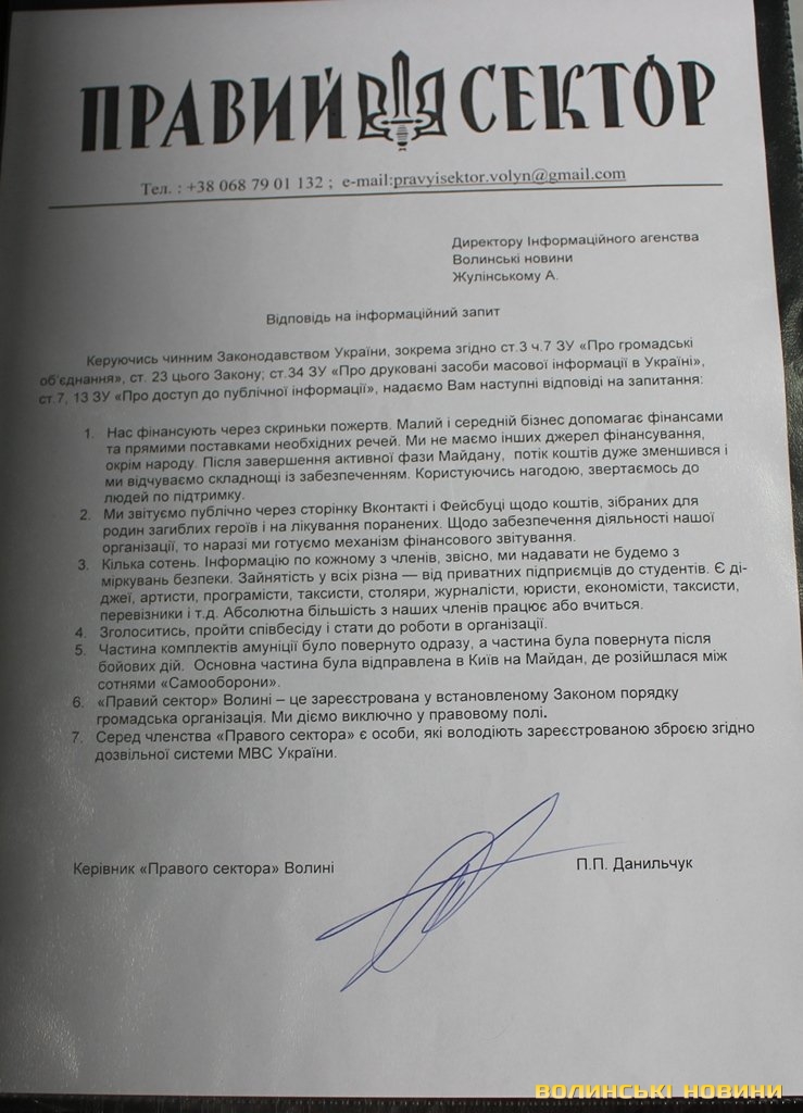 Інформаційне агентство Волинські Новини вирішило хоч трохи довідатися про Правий сектор Волині. З цією метою до організації надіслали інформаційний запит на ім’я керівника Правого сектора Волині Павла Данильчука.