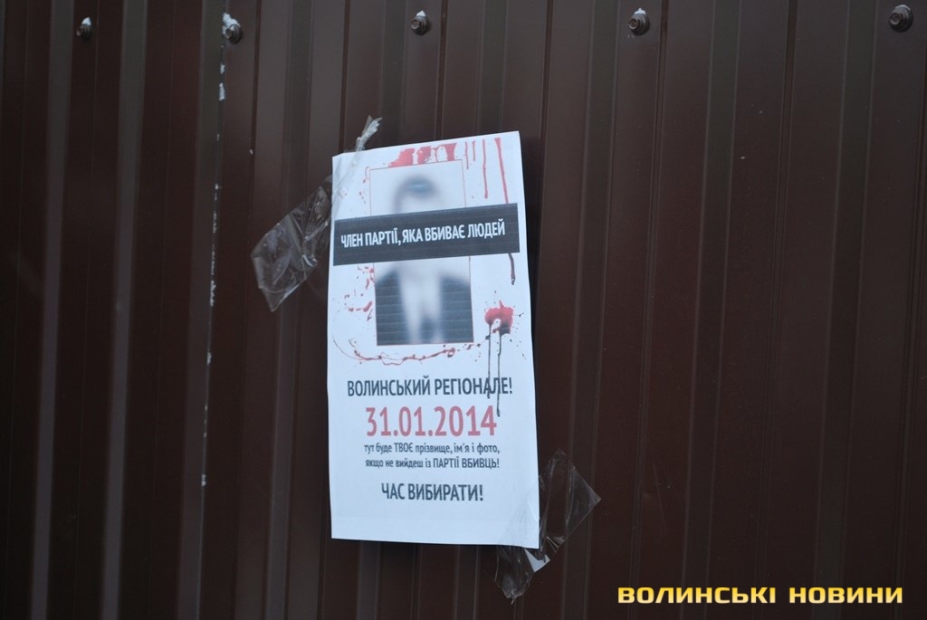 Окрім того, активісти пообіцяли розповсюджувати листівки з іменами та фотографіями членів Партії регіонів для того, щоб інші знали їх в обличчя. Декілька листівок люди наклеїли на паркан, яким огороджений офіс регіоналів. На ці дії звернули увагу правоохоронці, зазначивши, що вони є незаконними. Мовляв, розклеювати оголошення можна лише у спеціально відведених місцях, а саме – на інформаційних стендах.