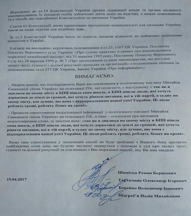 Саакашвілі каже, що БПП вимагає у мера Заліщиків Алли Квач вибачень і спростування за її висловлювання в ефірі політичного ток-шоу, що «в БПП пішла одна шваль».