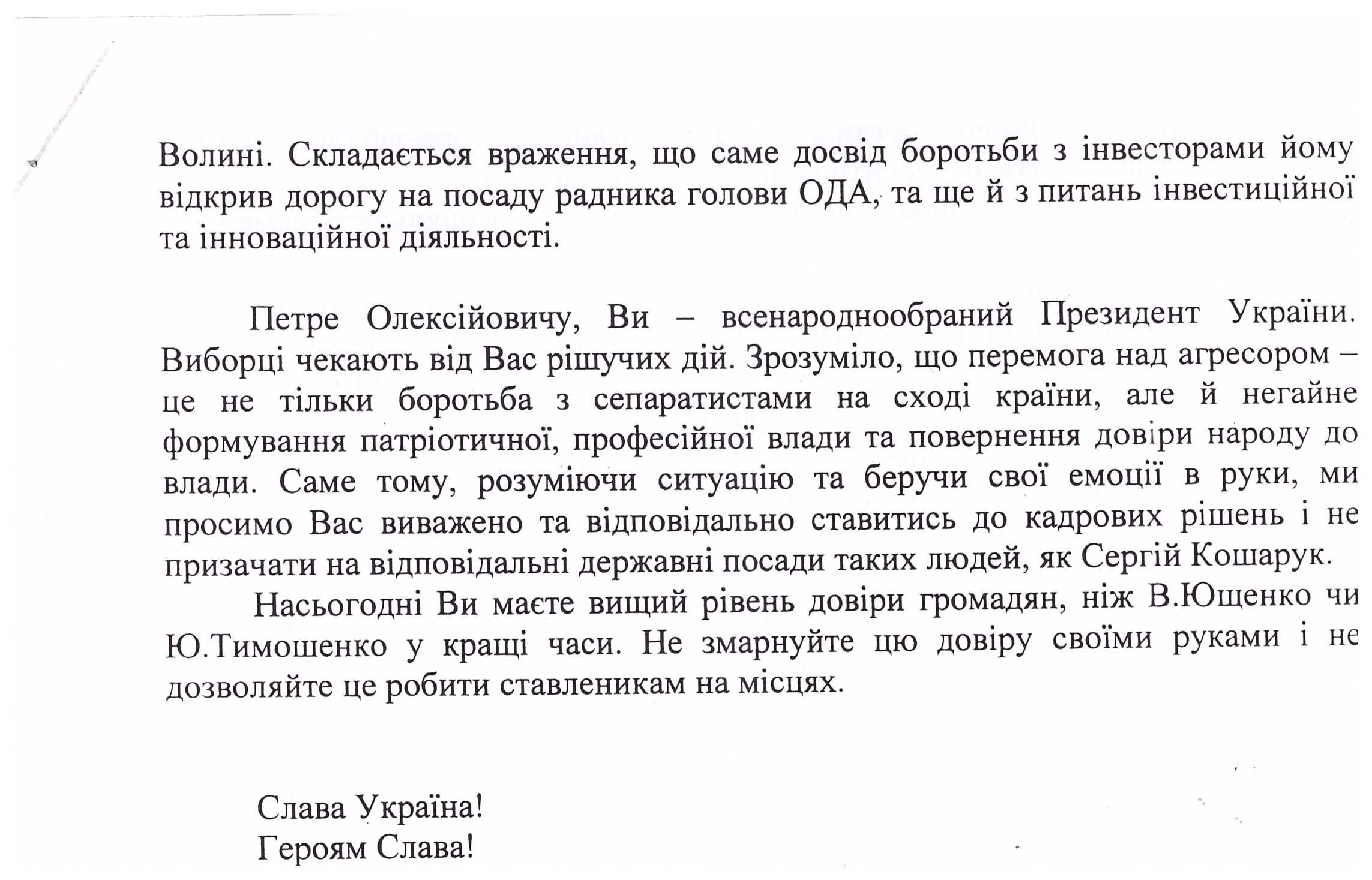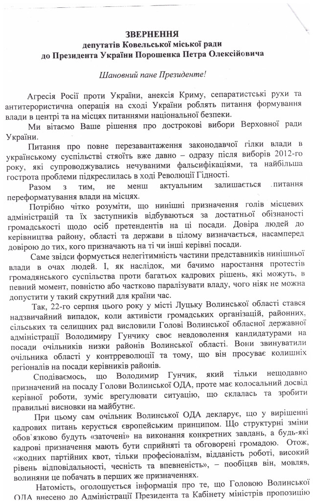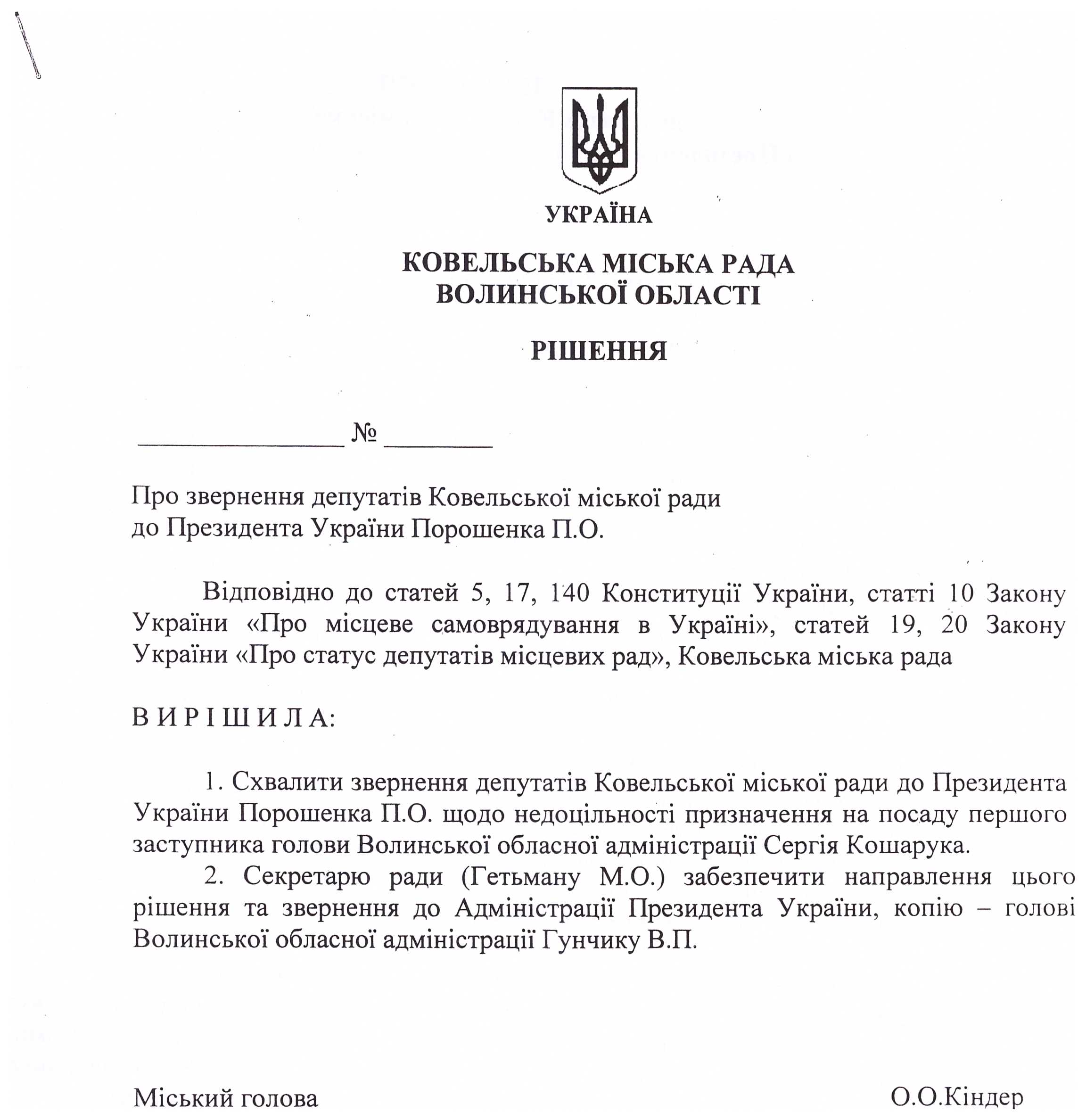 Так, чергова п’ятдесят дев’ята сесія Ковельської міської ради була надзвичайно неординарною. Ковельські депутати, дізнавшись зі ЗМІ, про те, що їх колега, Сергій Кошарук, може стати першим заступником голови Волинської ОДА, одразу ж підготували на чергову сесію звернення до Президента України Петра Порошенка, у якому застерігали главу держави від такого призначення (Текст звернення - нижче).