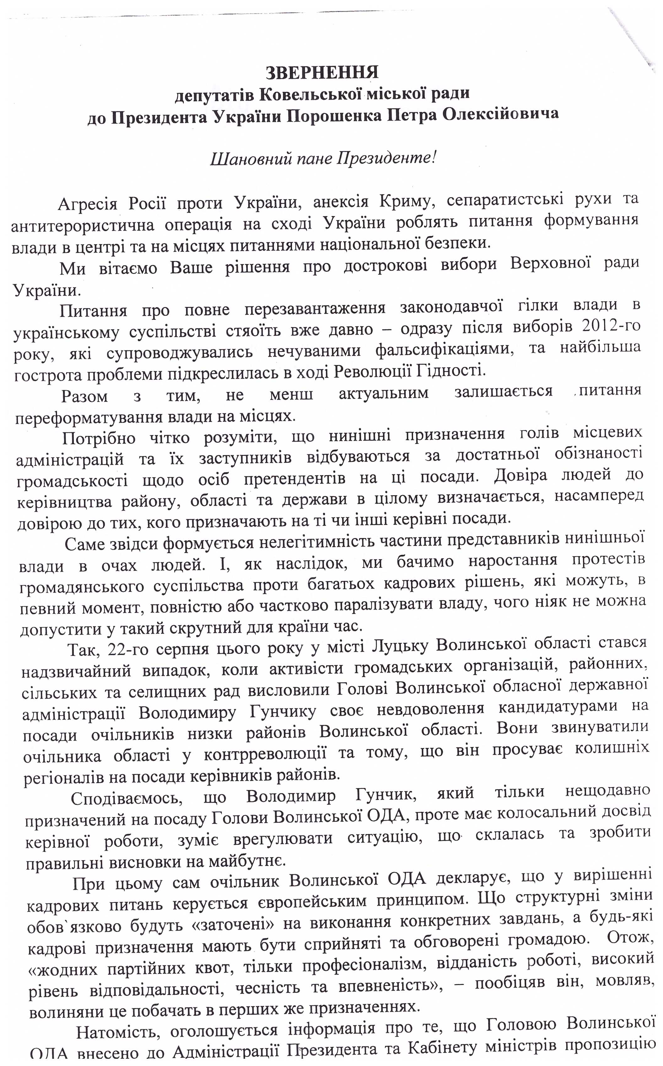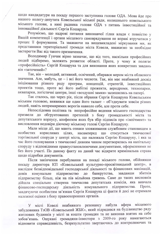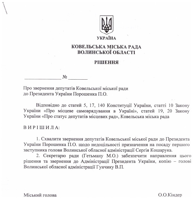 Врешті-решт ковельські народні обранці проголосували за те, аби надіслати Президенту України звернення щодо недоцільності призначення на посаду першого заступника голови Волинської обласної адміністрації Сергія Кошарука.
