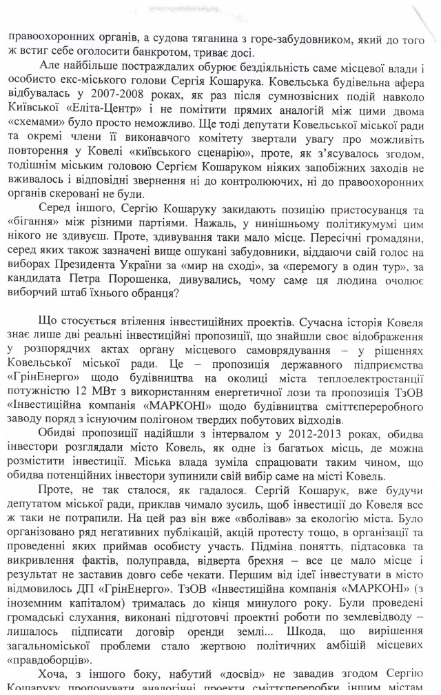 Коли Кошарук був мером, то злочинів у його діяльності ніхто не бачив, лише після приходу Кіндера БЮТ відразу побачив результат злочинної діяльності Кошарука на посаді, і відразу велика кількість фактів про порушення і їх доказів....?? Отже, ковельський БЮТ переживає явно не за інтереси громади Волині, (бо в минулі роки по наведених ними ж фактах, вони не переживали за Ковель і громаду) переживають вочевидь за свої особисті БЮТівські інтереси. Доречі ковельський БЮТ так активно заявив про себе і це співпало із поверненням Юлії Тимошенко у політичне життя країни - 27,28 серпня???? Питань ну дужу багато тепер.....................