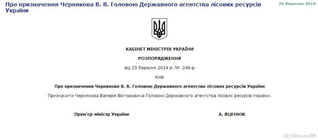 "Призначити Чернякова Валерія Вікторовича Головою Державного агентства лісових ресурсів України".