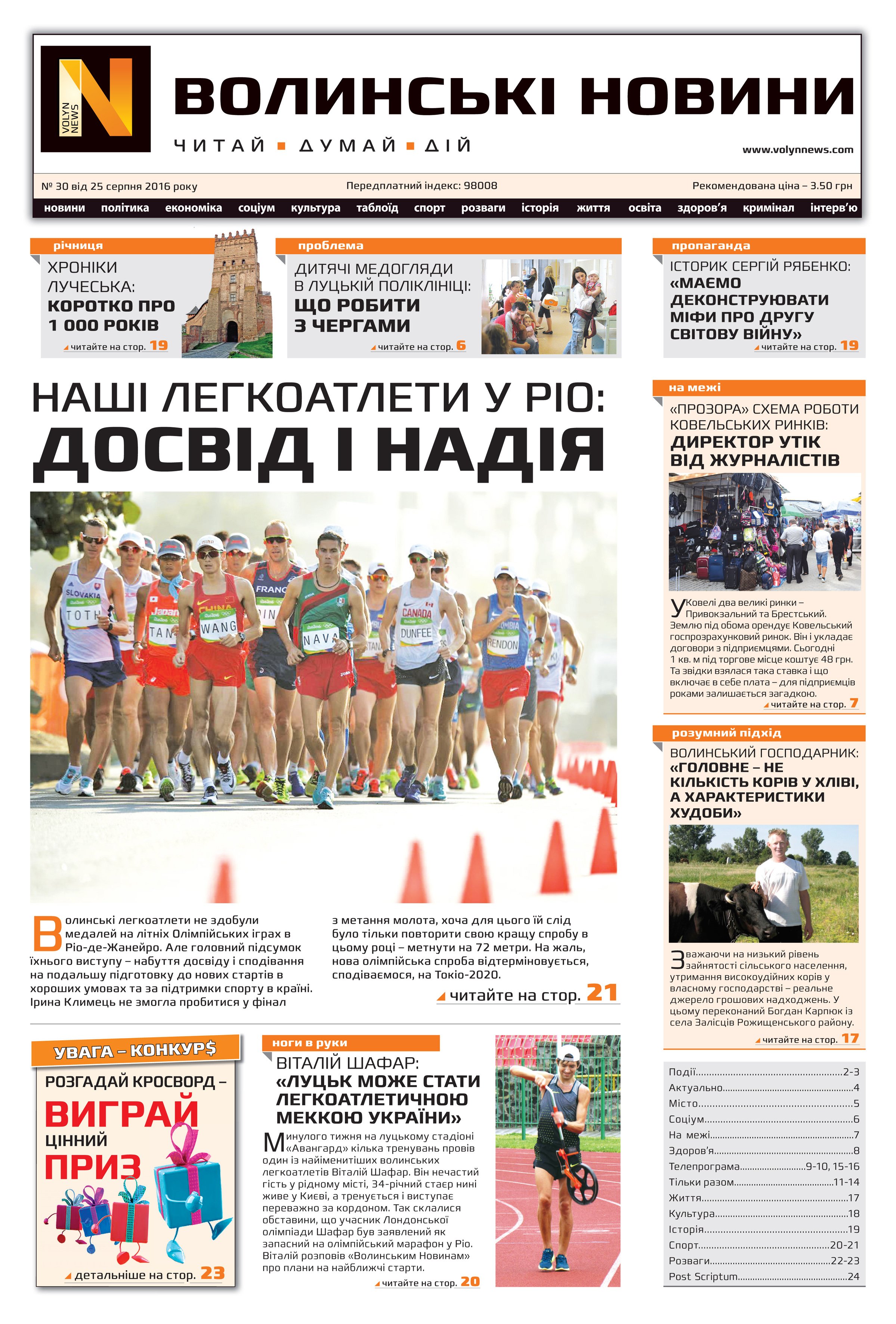 ВОЛИНСЬКІ НОВИНИ №30 ВІД 25.08.2016