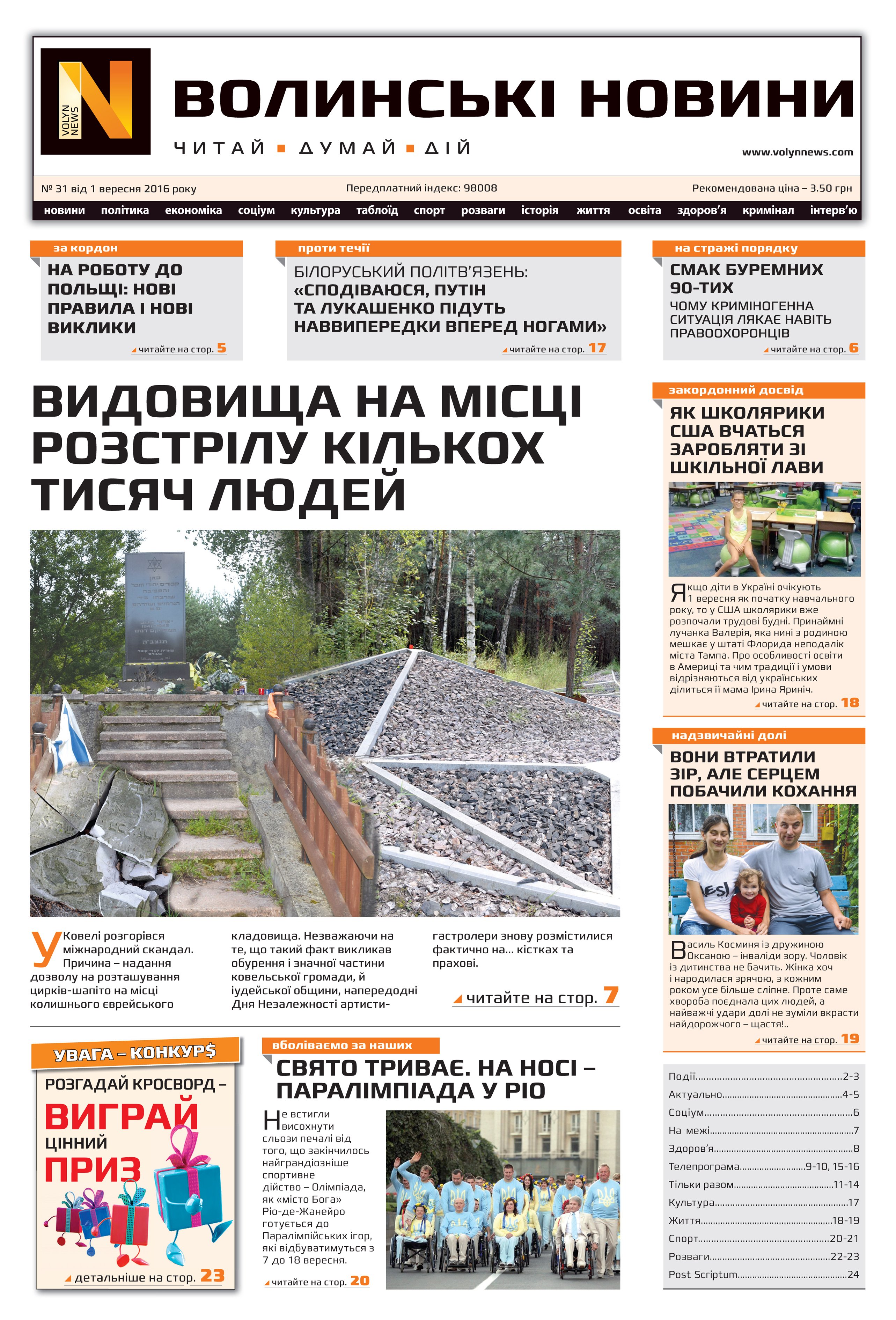 ВОЛИНСЬКІ НОВИНИ №31 ВІД 01.09.2016