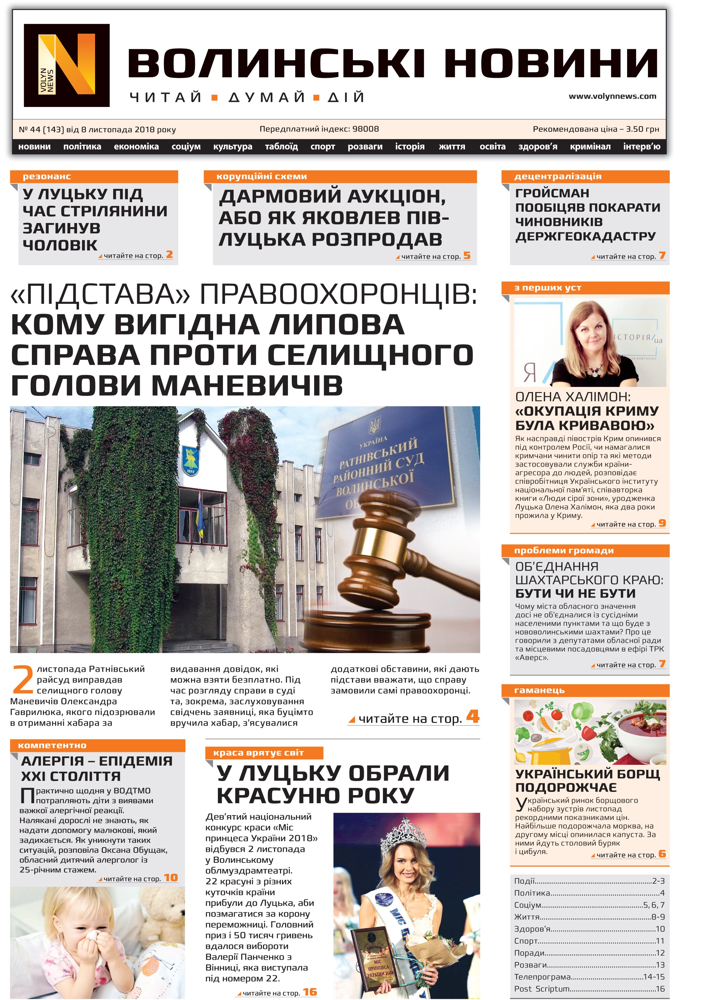 ВОЛИНСЬКІ НОВИНИ №44 (143) ВІД 08.11.2018
