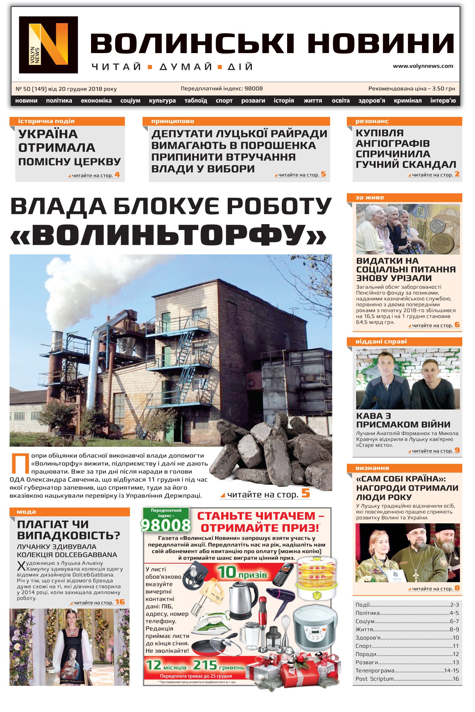 ВОЛИНСЬКІ НОВИНИ №50 (149) ВІД 20.12.2018