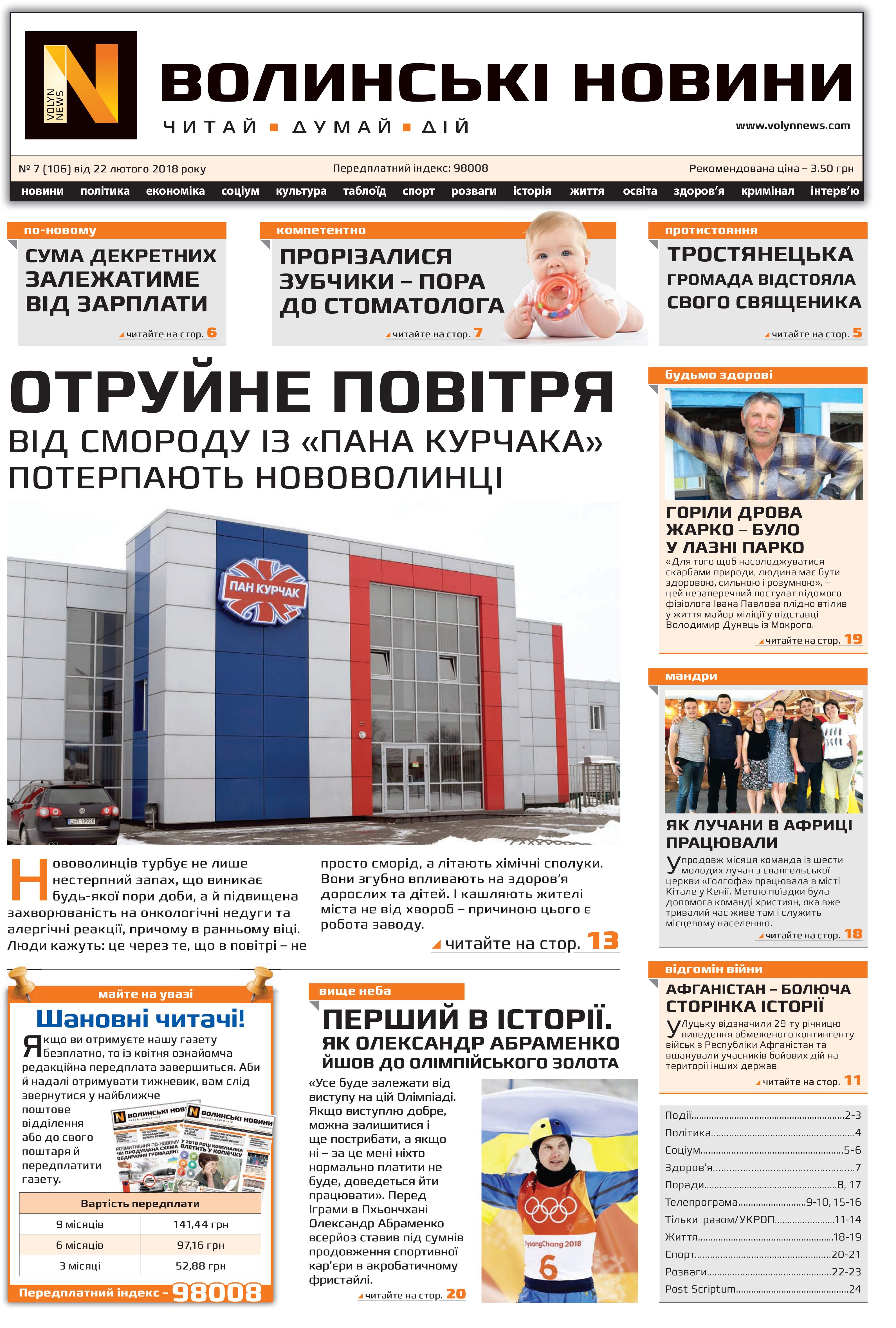 ВОЛИНСЬКІ НОВИНИ №7 (106) ВІД 22.02.2018