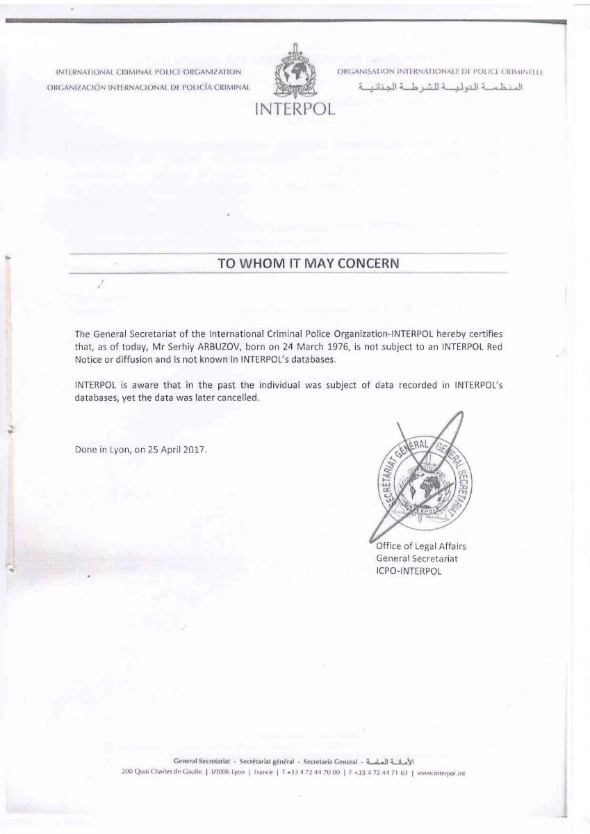Він пояснив, що такому рішенню відомства передував висновок комісії з питань контролю за файлами Інтерполу, яка розглянула аргументи Генпрокуратури та захисту Арбузова щодо цієї справи.