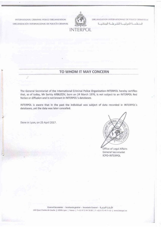 «Інтерпол скасував міжнародний розшук Арбузова. Тим самим Інтерпол поновив його право на вільне пересування», - заявив Ковальов.