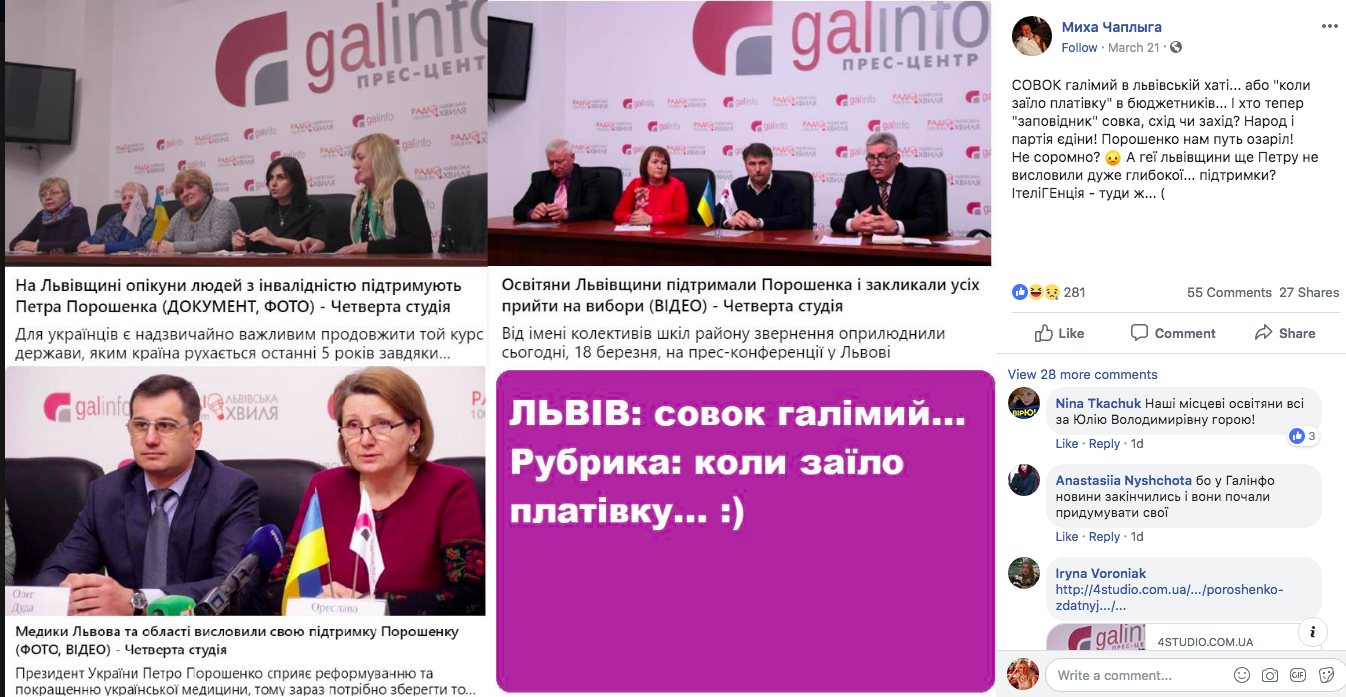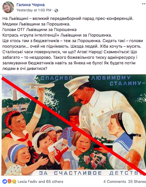 «На Львівщині – великий передвиборний парад прес-конференцій. Медики Львівщини за Порошенка. Голови об’єднаних територіальних громад Львівщини за Порошенка. Якась «група інтелігенції» Львівщини за Порошенка. Ще хтось там з бюджетників – теж за Порошенка. Сидять такі – голови опустили, очей не піднімають. Шкода людей. Хіба хочуть – повинні. Сталінські часи повернулися, чи що? Гей! Народ! Схаменіться! Що багато – це нездорово. Такого шаленого тиску, адмінресурсу і залякування бюджетників навіть при Янеку не було! Як будете потім людям в очі дивитися?» – написала на своїй сторінці в Facebook Галина Чорна, колишня журналістка і активістка львівської «Свободи».