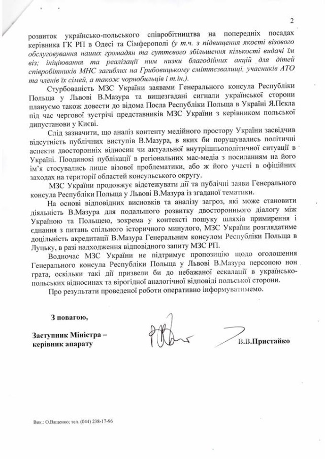 Як зазначається у відповіді МЗС, Вєслав Мазур визнав свою неправоту і запевнив, що антиукраїнська риторика більше не повториться (незалежно від його переконань).