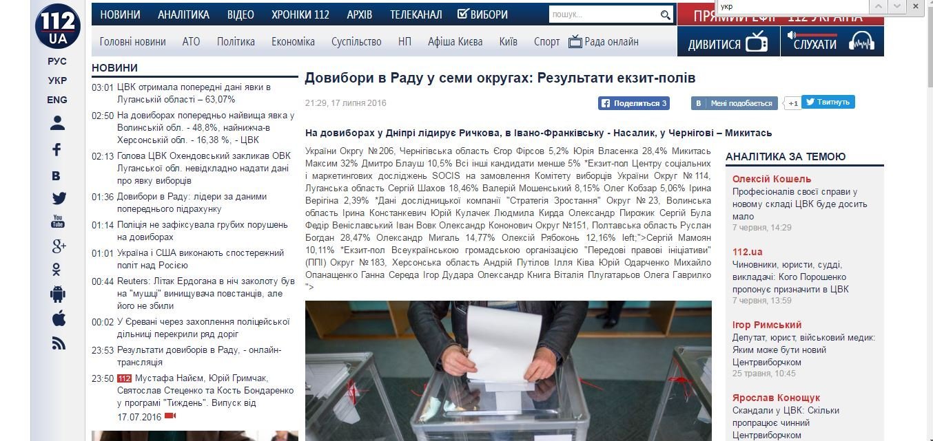 Окремі всеукраїнські ЗМІ поширили інформацію про результати екзит-полів, проведених Центром соціальних і маркетингових досліджень SOCIS на замовлення Комітету виборців України. Зокрема, 112-й канал опублікував дані і по окрузі №23.Проте, як повідомив Олексій Кошель, екзит-поли організували лише на трьох округах: в Івано-Франківській, Чернігівській областях та в Дніпрі. Разом з тим, жодних досліджень у Волинській області не проводили.