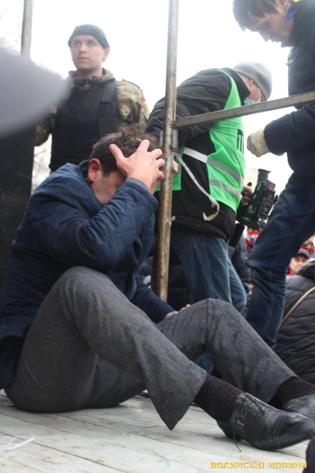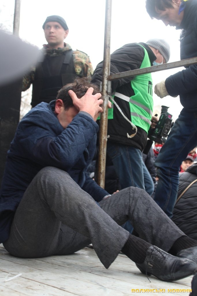 Нагадаємо, Олександра Башкаленка вивели на сцену майдану та Театральній площі, аби він там привселюдно став на коліна перед людьми. Натовп готовий розірвати Башкаленка живцем. Його обгородили міліцейськими щитами, дали папір та ручку і змушують написати заяву про звільнення. Він категорично відмовляється і переконує, що ще може зробити для Волині багато хорошого.