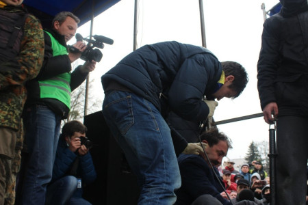 Навколо сцени народна самооборона утворила коридор і пропускає лише журналістів. Адже розлючені активісти прагнуть підійти ближче до сцени і ймовірно чинити розправу над Башкаленком.