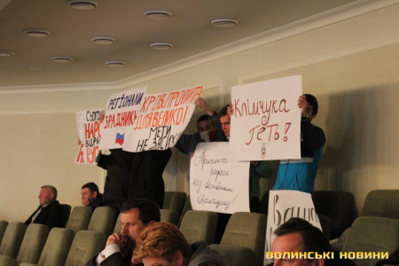 Молодь прийшла з плакатами, на яких написано: «Регіонал зрадник», «Клімчука геть», «Де ваша совість?».