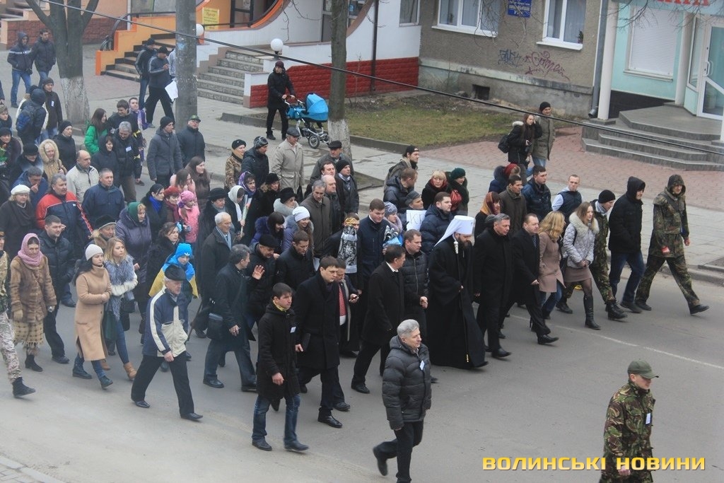 14:18 Колона на чолі із бійцями Правого сектору та Волинської самооборони рушили до Меморіалу Слави для для вшанування пам’яті загиблого у Києві волинянина Василя Мойсея. Нагадаємо, молодого хлопця поховали там 23 лютого. Віче завершилося.