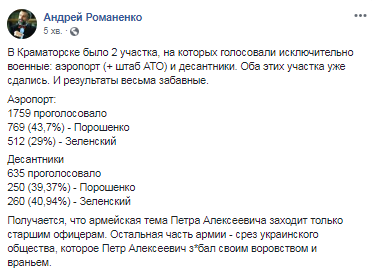 «У Краматорську було 2 дільниці, на яких голосували виключно військові аеропорту (+ штаб ООС) і десантники. Обидві ці дільниці вже здалися. І результати дуже цікаві.