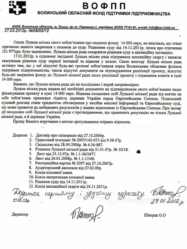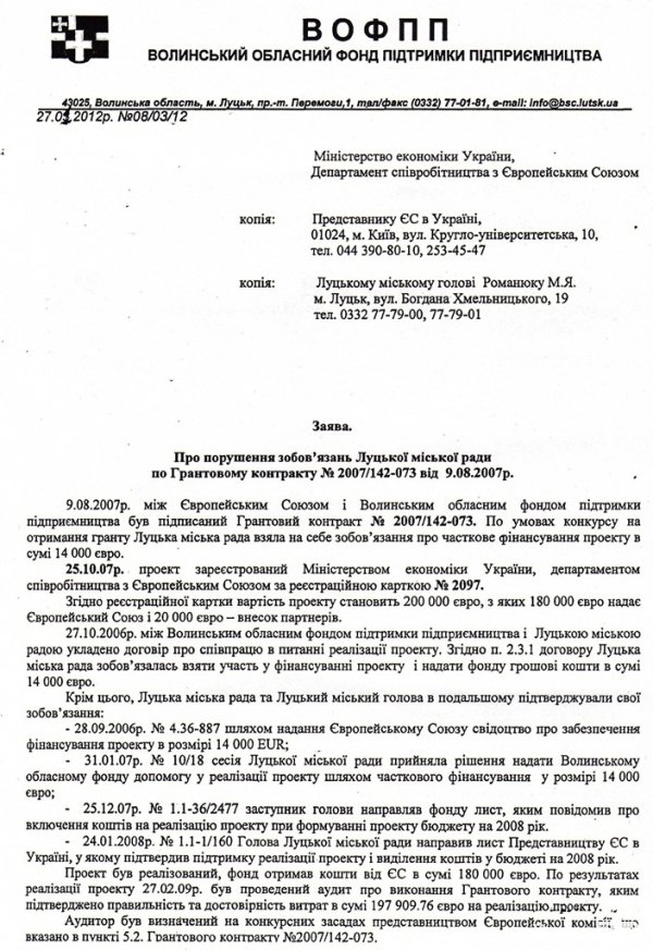 У розпорядженні видання опинилася копія Заяви про порушення зобов’язань Луцької міської ради щодо Грантового контракту. Цю заяву директор Волинського обласного фонду підтримки підприємництва Ольга Шворак 27 січня 2012 року надіслала у Міністерство економіки України, Департамент співробітництва з Європейським Союзом.